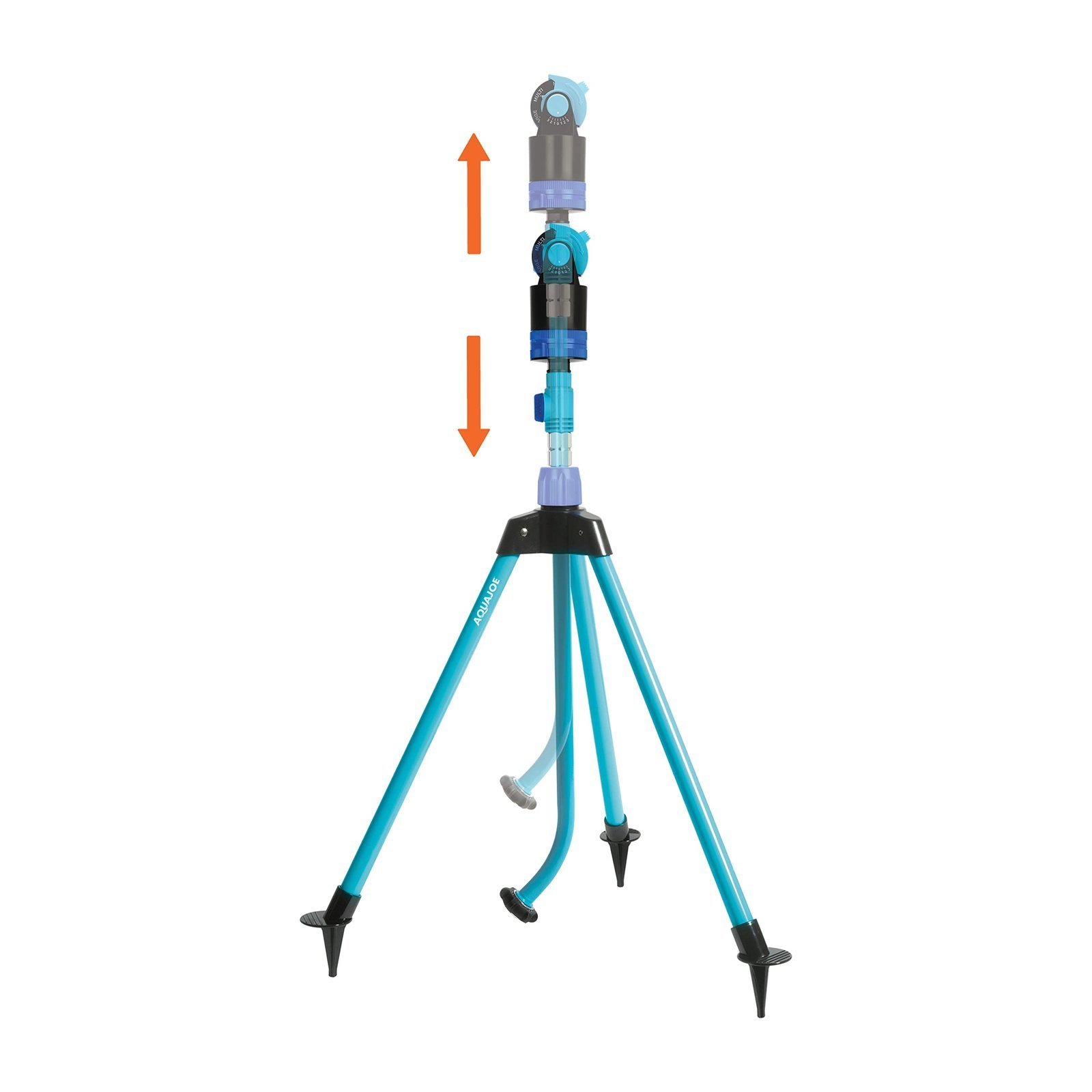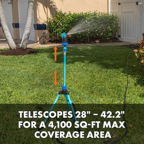 WATER YOUR WAY! Keep your garden green and your lawn lush with the Indestructible Turbo Drive 360 Telescoping Tripod Sprinkler/Mister from AQUA JOE. Water up to 4,100 sq ft, with a spray of up to 72.2 ft in diameter for maximum coverage! The 6 adjustable spray patterns—flat, fan, large, multi, mini, and mist—and telescoping height adjustment let you perfectly customize your spray to suite the terrain. The rotating head can cover a full 360 for even water dispersal, and the heavy-duty, impact-resistant metal construction and leak-resistant hose connection will keep your garden well-watered, season after season. So, give your lawn a cool drink of water and Go With Joe. The Indestructible 6-Pattern Turbo Drive 360 Degree Telescoping Tripod Sprinkler. GET EQUIPPED.